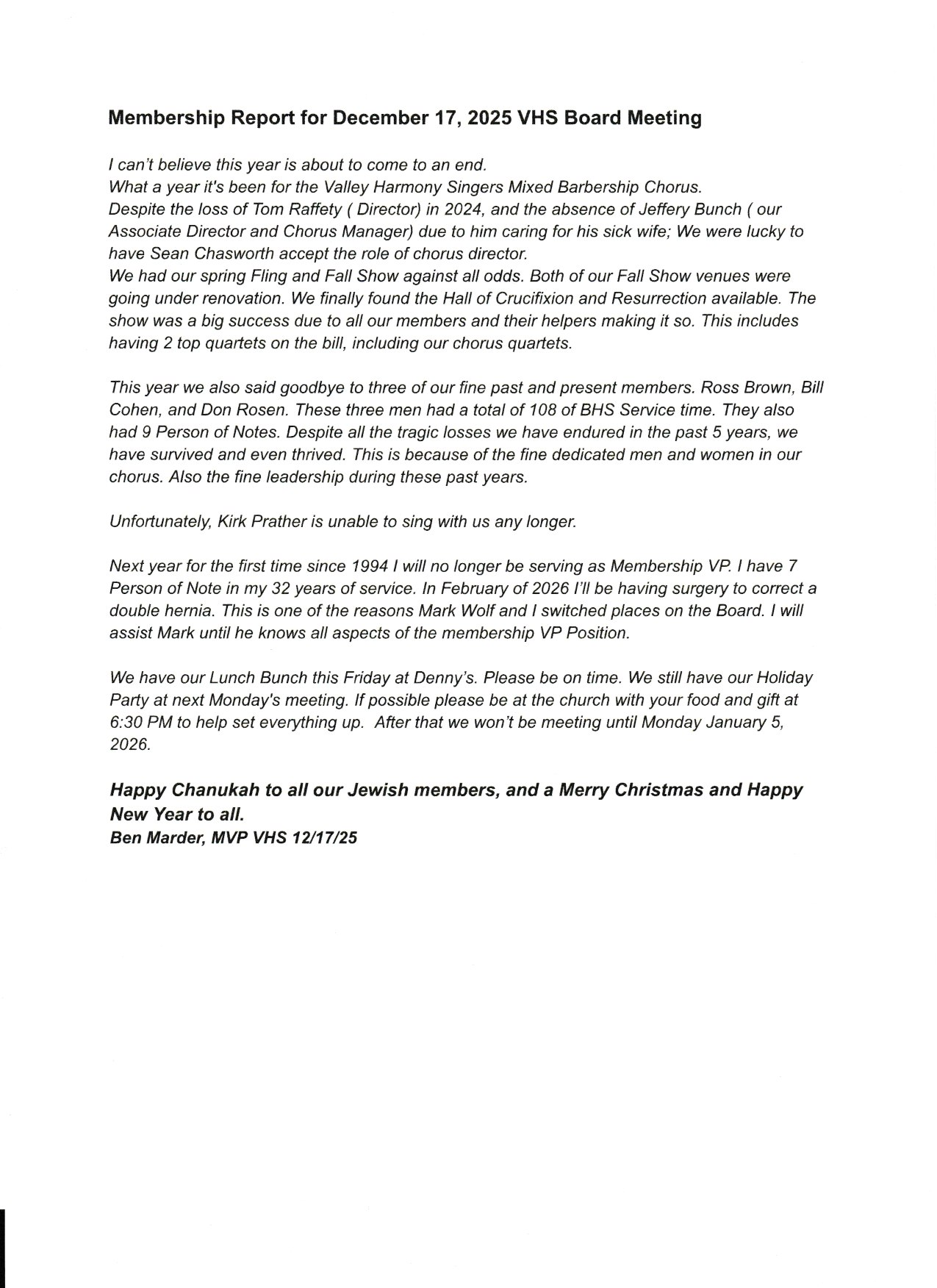 Membership Report for 12/17/25 VHS Board Meeting